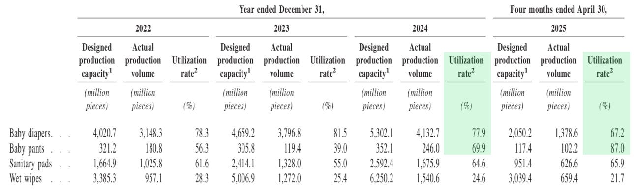 Por otro lado, en el prospecto de salida a bolsa la empresa informa la evolución de la capacidad anual y el nivel de producción año a año. Es interesante ver que el índice de utilización de la producción de pañales está en torno al 70% los últimos años, y la de toallitas femeninas entre el 70 y el 87%.