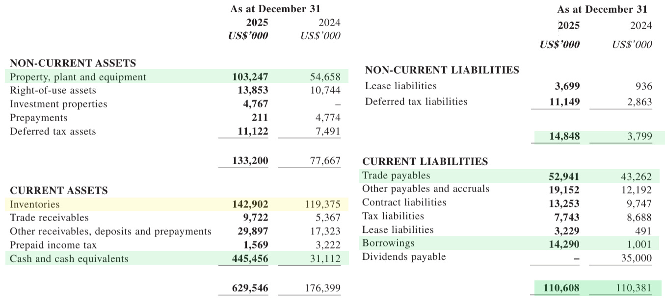 Esos 19,5 años los podríamos mirar con mejores ojos si vemos el balance. De 2024 a 2025 la empresa aumentó casi un 100% sus activos no corrientes, producto de la nueva planta de El Salvador y 18 nuevas líneas de producción que aumentaron de 48 líneas en 2024 a 66 a finales de 2025. Los inventarios aumentan de 119 a 142, un 20%, en línea con el incremento de ventas de la empresa. Aparecen 445 millones de USD en efectivo, producto de la emisión de acciones de salida a bolsa. Por el lado del pasivo tenemos solamente 14 millones de préstamos de corto plazo y el pasivo total es de 110 millones de USD. Siendo conservadores, restemos todo el pasivo al efectivo en caja: 445 - 110 millones de USD: nos quedan limpios 335 millones de USD.
