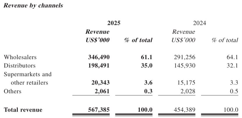 El 61% de las ventas se hacen a mayoristas, que compran productos al por mayor para revenderlos a otros mayoristas de menor nivel o a minoristas locales. Se enfocan en la compra, almacenamiento y venta, pero generalmente no cuentan con servicios de distribución o entrega propios. El 35% se vende a distribuidores, que son socios con capacidades de marketing robustas, equipos de venta profesionales y vehículos de entrega propios. Se encargan del desarrollo proactivo del mercado, especialmente en áreas remotas, asegurando que el producto llegue a puntos de venta finales. Gestionan las ventas, entregas y el servicio al cliente dentro de territorios geográficos específicos. Y por último, tan solo un 3,6% se vende directamente a supermercados o tiendas minoristas.