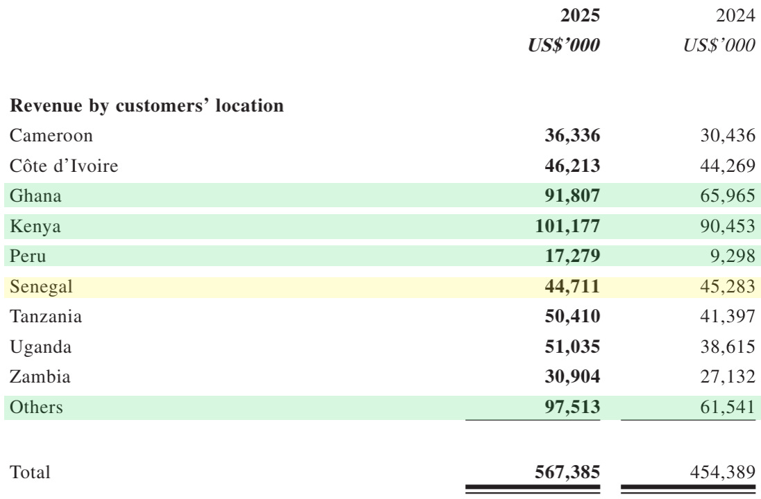 En los resultados del año 2025 publicados recientemente, podemos ver la distribución de ventas por país. Se destaca el crecimiento generalizado de ventas en USD. Para destacar el crecimiento del 87% en Perú, 32% en Uganda y el 58% en “Otros”. El único país donde no hubo crecimiento fue en Senegal.