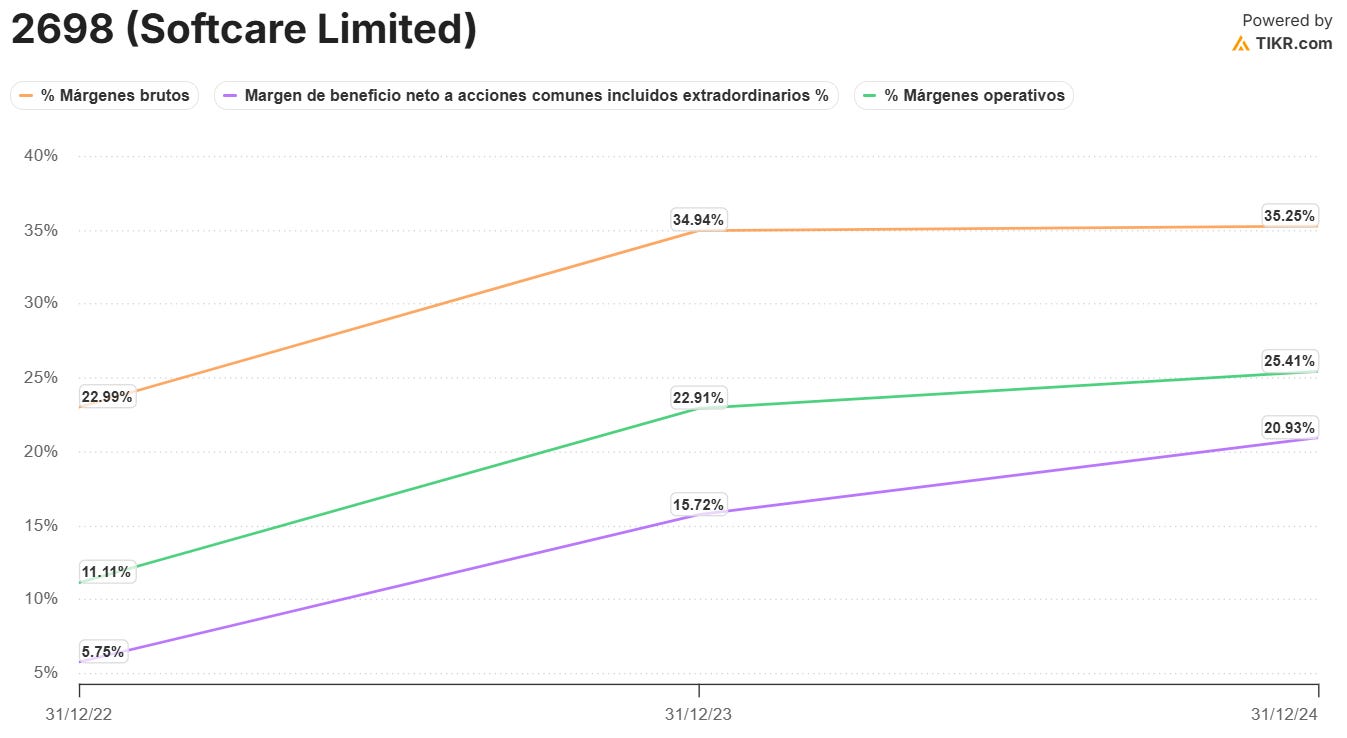 Teniendo en cuenta que la Capitalización de mercado de Softcare es de 2.362 millones de USD, la empresa está cotizando actualmente a 19,5 años del Beneficio Neto del año 2025.
