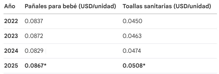 Importante ver la evolución del precio por unidad en USD de 2022 a 2025. El precio para los pañales se mantuvo estable y el de las toallitas sanitarias aumentó. Esto fue en el marco de monedas locales que se han devaluado considerablemente.
