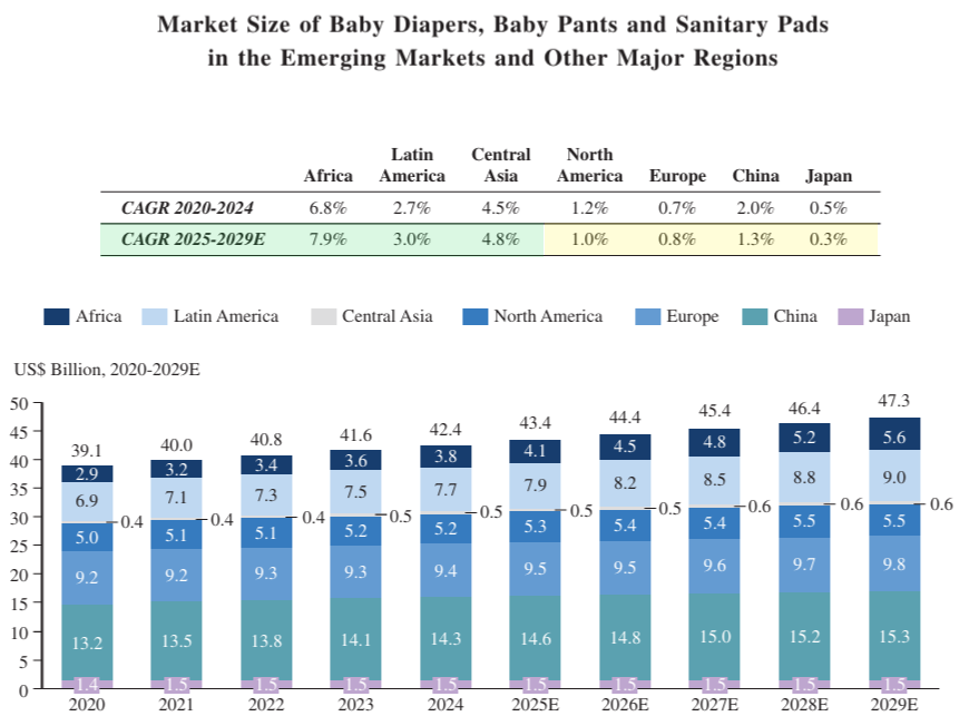 Según la consultora Frost & Sullivan, el mercado de pañales para bebés, baby pants y toallitas sanitarias de África, América Latina y Asia Central, crecerá a tasas considerablemente mayores que las de otras zonas más desarrolladas.